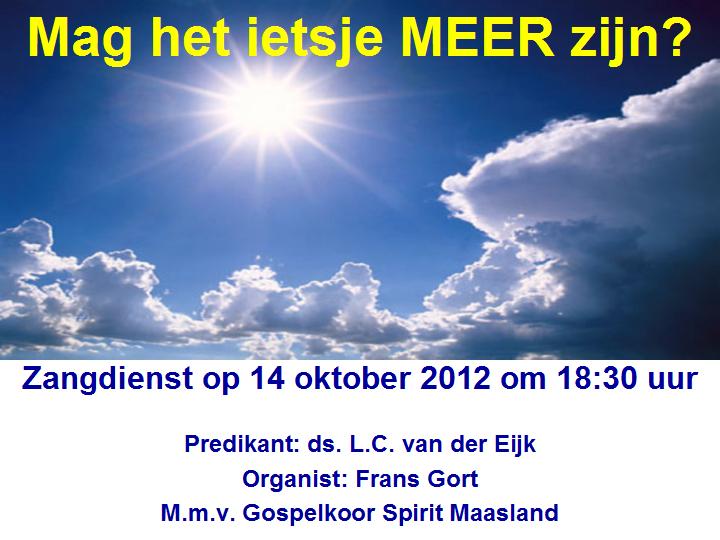 Maar dat bedoelen we hier niet. Als het goed is, streven we als Christenen naar meer liefde, trouw, gemeenschap, kracht, geloof, genezing, blijdschap, en ga zo maar door. En hoe kunnen we meer van God ervaren en van de Heilige Geest? Daarover zal Ds. L.C. van der Eijk uit Maasdijk een korte overdenking houden.